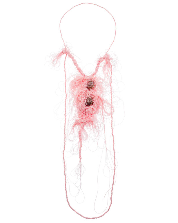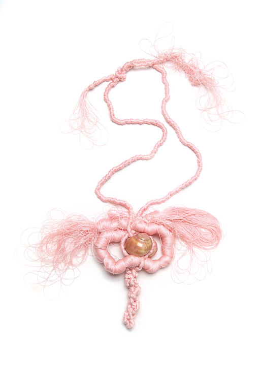 Necklace, 8, 2024 polyester thread, snail shell, resin 64cmx14cmx4cm 87gr Knotting , enamel