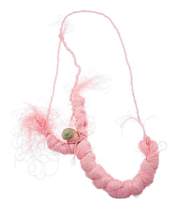 Necklace, 8, 2024 polyester thread, snail shell, resin 64cmx14cmx4cm 87gr Knotting , enamel